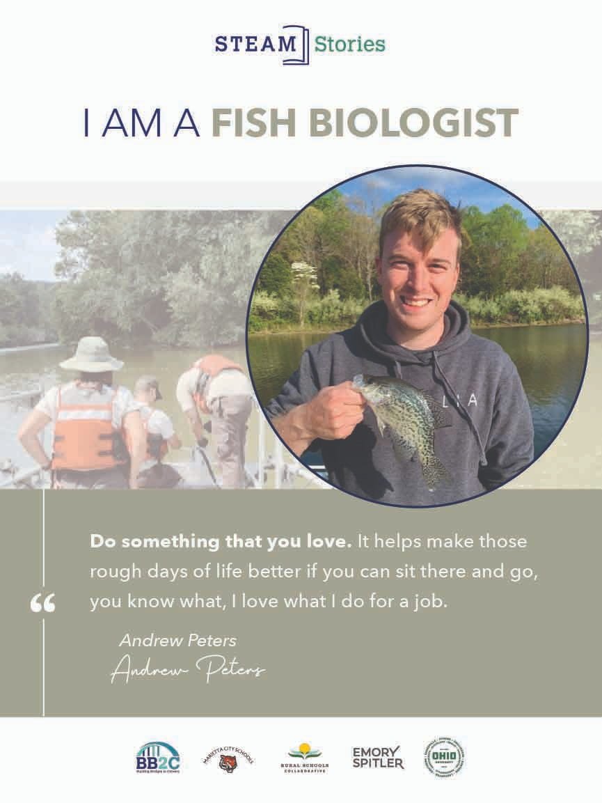 Fish Biologist, Andrew Peters STEAM Story Materials Click Here to Download 12X16 Poster Click Here to Download Story Click Here to Download 18X 24 Poster
